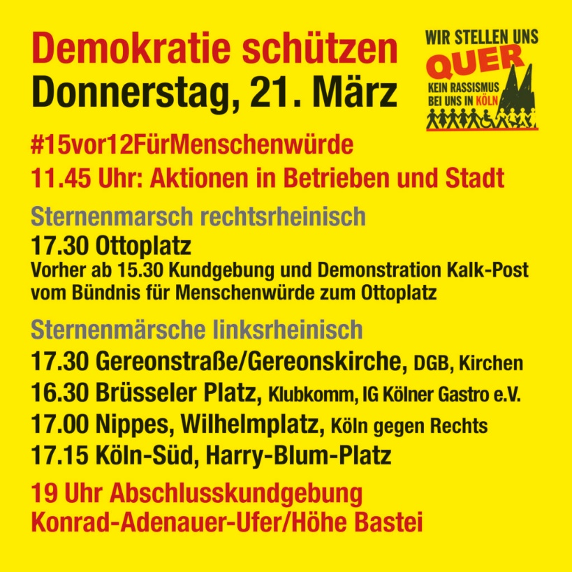 Gleichzeitig drücken die hier seit langem lebenden Rom:nja ihre Solidarität mit den neu ankommenden Geflüchteten aus den sogenannten (un)„sicheren Herkunftsländern“ aus. Ca. 1/3 der in Köln derzeit untergebrachten Geflüchteten kommen vom Balkan. Viele davon sind Rom:nja. Sie sind Opfer der derzeitigen repressiven Flüchtlingspolitik, die in Bund und Land vorherrscht. Dagegen brauchen die Rom:nja Bleiberechte; auch angesichts des nationalsozialistischen Völkermordes an Rom:nja in den damals besetzen Balkan-Ländern.